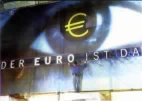法兰克福交易所换上『启用欧元』横标1999年1月1日,欧元在欧盟各成员国范围内正式发行,它是一种具有独立性和法定货币地位的超国家性质的货币,欧盟根据《马斯特里赫条约》规定,欧元将于2002年1月1日起正式流通。目