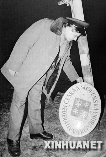 1993年1月1日,在斯洛伐克和匈牙利边境,一名斯洛伐克边防士兵取下写有『捷克和斯洛伐克』字样的标志牌。从1993年1月1日起,捷克和斯洛伐克两共和国成为两个独立的主权国家。