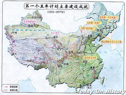 第一个五年计划建设成就1953年1月1日,中华人民共和国发展国民经济的一五计划开始实行。第一个五年计划,简称『一五』计划(1953—1957),是在党中央的直接领导下,由周恩来、陈云同志主持制定的,1955年7月