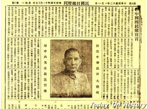 民国日报对《中国国民党宣言》的报道1923年1月1日,孙中山发表《中国国民党宣言》。孙中山改组的国民党已进入一个新阶段。孙中山在共产国际和中国共产党的帮助下,于1922年9月着手国民党改组的准备工作。这