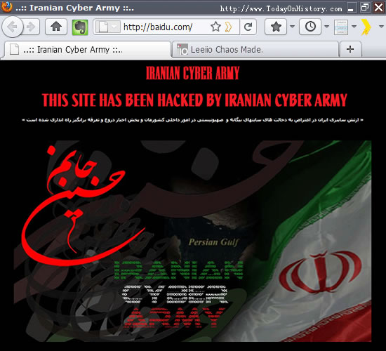 2010年1月12日上午7时许,中国最大搜索引擎百度突然无法登陆,主页背景黑色,且有伊朗网军等字样。百度回应说,该事件源于其在美国域名注册商处被非法篡改,导致网站不能被正常访问,到昨天下午4时百度主页访问恢复