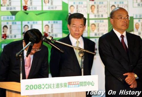 民进党主席陈水扁(左)为败选负责,请辞党主席。谢长廷、苏贞昌表情严肃。2008年1月12日,在『立委』选举民进党大败后,陈水扁于当天晚间9时30分许宣布辞去民进党主席职务。台湾地区第七届『立委』