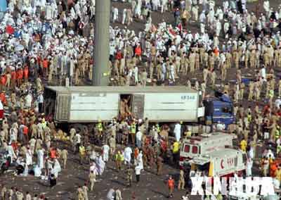 2006年1月12日,在沙特阿拉伯麦加附近,工作人员转移在踩踏事件中丧生的朝觐者。沙特卫生大臣哈马德·本·阿卜杜拉·马尼阿12日说,伊斯兰教圣地麦加当天中午发生拥挤踩踏事件,造成至少345人死亡