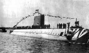 340英尺长的『鹦鹉螺』号在格罗顿港1954年1月21日,第一艘以原子能为动力的潜水艇--『鹦鹉螺』号在美国康涅狄格电船公司的船坞下水。1.2万多名工人和观众聚在临时看台上观看。总统夫人玛米·艾森豪威尔在传统