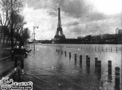 水中的埃菲尔铁塔1910年1月26日,一场寒冷、无情的雨水接连在巴黎下了一个多星期,使街道房屋被淹,估计造成的经济损失达两亿美元。塞纳河水达最高水位,目前有淹没罗浮宫雕像陈列室的危险。据报,《米洛的维纳斯》