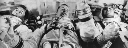 三名宇航员正在进行训练1967年1月27日。宇航员维尔基尔-格里森、爱德华-怀特和罗杰-查菲在今晚一场大火中身亡。当时这场大火吞没了他们的阿波罗1号飞船。原计划2月21日飞船发射并把他们送上地球轨道14天,就在进行这