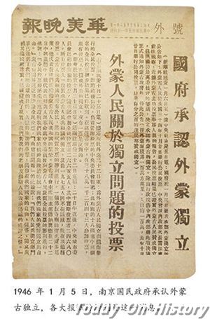 报纸报道1946年1月5日,中华民国承认蒙古人民共和国独立。国民政府公告说:『外蒙古人民于1945年10月20日举行公民投票,中央曾派内政部次长雷法章前往观察,近据外蒙古主持投票事务人员之报告,公民投票结果