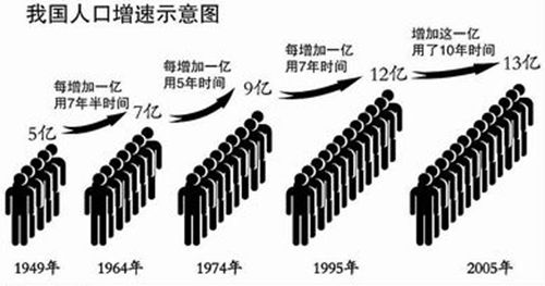 人口增速示意图2005年1月6日,中国内地(不包括香港特别行政区、澳门特别行政区和台湾省)人口达到13亿。2005年1月6日是中国13亿人口日。根据国家统计局统计,中国大陆总人口达到13亿(不含香港、澳门特别行政