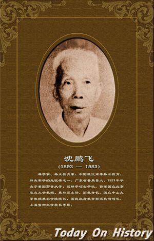 沈鹏飞1983年1月6日,中国著名林学家、林业教育家沈鹏飞逝世,享年90岁。沈鹏飞,字云程。广东番禺人,生于1893年7月5日,幼年在番禺私塾读书,聪颖好学,打下了比较好的文学基础。14岁入两广方言学堂学习,