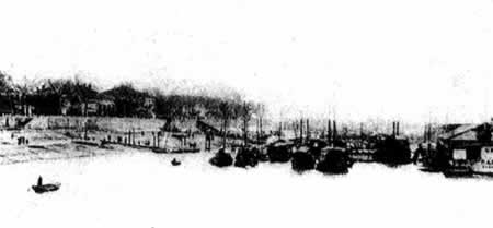图中江左岸是英租界1月6日,九江数万人群众上街游行,声援汉口收回租界。已罢工一个多月的怡和、太古两码头工人纠察队员吴宜山,发现英人强迫工人搬运行李,并偷运大米接济从武汉撤下来的英军军舰,立即上前制止。英