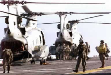 美海军在海湾登上直升机1998年12月16日,就在离美国会众院开会表决是否弹劾克林顿不到20小时的时候,白宫突然对伊宣战。随着克林顿的一声令下,部署在海湾地区的美军战舰和轰炸机向伊拉克发射了二三百枚联合国武器核