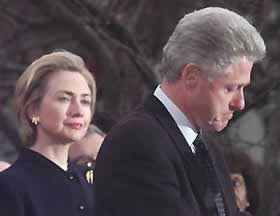 克林顿与希拉里1998年12月19日美国众议院举行全体会议,以简单多数通过了弹劾总统克林顿的两条理由——在与其有关的绯闻案中『作伪证』和『妨碍司法』。克林顿从而成为美国历史上第二位遭弹劾的总统。这是