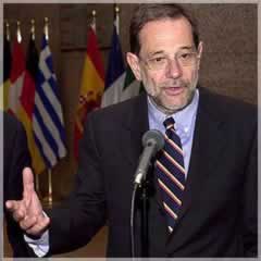 索拉纳1995年12月19日,西班牙前外交大臣哈维尔-索拉纳在北约布鲁塞尔总部正式就任北约新秘书长。索拉纳向新闻界发表讲话时强调,北约『是新的欧洲安全格局一个不可替代的要素』,北约『应当继续把欧洲和北美联结在