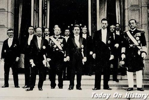 近卫文麿(第一排右数第二个)及其内阁大臣1938年12月22日,日本近卫文麿内阁第三次发表诱降蒋介石、企图灭亡中国的声明,史称第三次近卫声明。日本政府,昭和13年曾一再声明,决定始终一贯地以武力扫荡抗日