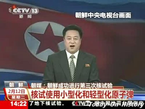 朝鲜中央电视台播报朝鲜已进行第三次核试验2013年2月12日,朝鲜进行第三次核试验。朝中社12日发表新闻公报。朝鲜国防科学部门于主体102(2013)年2月12日在吉州郡丰溪里核试验场成功举行了第三次地下核试