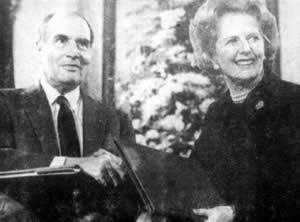 法国总统密特朗和英国首相撒切尔夫人交换英法海峡隧道条约文本1986年2月12日英国首相撒切尔夫人和法国总统密特朗在英国东南部的坎特伯雷大教堂参加了英法两国海峡隧道条约的签字仪式,从而正式确认了两国政府对于建