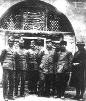 毛泽东接见印度援华医疗队。左二:柯棣华,右二:爱德华1939年2月12日,印度援华医疗队经长途跋涉,到达延安,受到热烈欢迎,毛泽东亲自接见了他们。1937年年底,印度国民大会决定派遣医疗队援华抗日。今年1月9日,