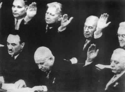 赫鲁晓夫在苏共二十大上1956年2月14日,赫鲁晓夫上台后召开党的二十次代表大会,会议期间,赫鲁晓夫作了反斯大林的秘密报告。出席会议的1400名代表中有近40%是在斯大林逝世后提拔起来的。赫鲁晓夫向大会作了党中央