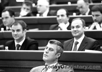 新当选的科索沃总理萨奇(前)在普里什蒂纳举行的科索沃议会会议上2月16日1000多人在塞尔维亚首都贝尔格莱德举着标语游行,反对科索沃独立科索沃议会2008年2月17日举行特别会议,通过了科索沃独立宣言。科索沃议会