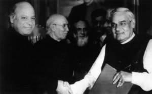瓦杰帕伊与谢里夫(左一)握手1999年2月20日,印度总理瓦杰帕伊乘坐首辆正式运行的印巴跨境客运汽车抵达巴基斯坦第二大城市拉合尔,对巴进行为期两天的正式访问。这是10年来印度总理首次访问巴基斯坦。访问期间,瓦