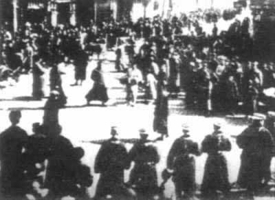 工人、学生和市民在老西门一带与军警对峙1927年2月22日,上海工人举行第二次武装起义。上海工商学各界和共产党、国民党代表于22日成立『上海市民临时革命委员会』,当天下午4时,中共上海区委发出特别紧急通告,动员