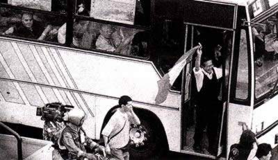 总统藤森(车门口手持旗帜者)送获救人质去医院1997年4月22日下午,秘鲁军警对日本驻秘鲁大使官邸实施突袭,解救在那里被『图帕克-阿马鲁革命运动』扣押的72名人质,并获得了成功。据报道,突袭行动是从当地时间下午