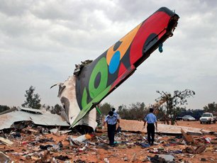 从南非起飞的利比亚航班5月12日在的黎波里机场坠毁2010年5月12日,利比亚首都的黎波里国际机场安全人员称,一架载有104名乘客和机组人员的航班12日坠毁,仅一名10岁荷兰儿童幸存。该机场工作人士称:『除一名儿童外
