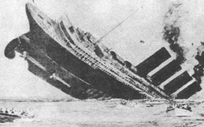被德军鱼雷击中几分钟后的『卢西塔尼亚』号客轮1915年5月12日,英国『卢西塔尼亚』号客轮被击沉,至少有124名美国人丧生,威尔逊总统为此向德国政府提出强烈抗议。威尔逊的照会明天将由大使杰拉德转交德国外交部。照