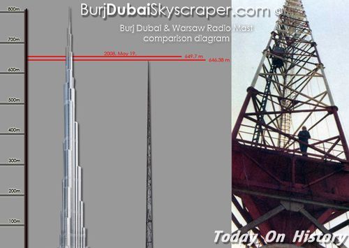 波兰华沙电台广播塔和迪拜塔对比1974年5月18日,波兰华沙电台广播塔建成,高646.38米,成为当时世界最高的建筑结构。该塔塔体是以边长为4.8米的等边三角形截面的钢格架搭建而成,其塔尖部分则由一系列直径24