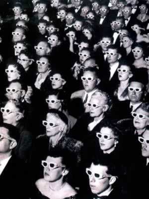观看立体电影的人们为了把观众从电视夺回来,好莱坞推出了一种新玩艺儿--立体电影。戴着特殊眼镜的观众像在观看《布瓦那魔鬼》及《蜡屋》这类惊险片那样,发现自己躲在逃跑的火车及魔鬼的后面。
