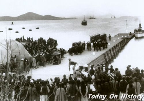 英军登陆威海卫时的情景1898年5月24日,英军登陆威海卫。汉初时,威海叫『石落村』,是一个偏僻的小村,后来又称为『落柑村』,据后人推测,之所以改为这个名字可能是因为这里遍地布满了柑橘树的缘故,至于