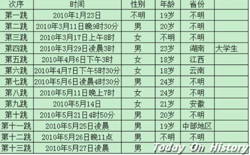 富士康跳楼事件表2010年5月25日凌晨,在华南富士康观兰分厂,观兰镇樟坑径村一男子坠楼,当场死亡,据悉死者叫李海,男,湖南醴陵人,中专学历,死亡时年仅19岁,入职富士康42天,精加厂员工,这是富士康当年发