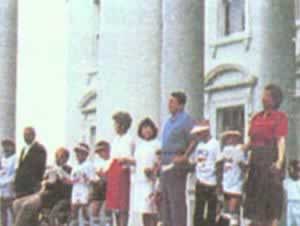 『手挽手穿越美国』为穷人募捐的活动美国号称当代世界上经济实力最强、最富有的国家,可是美国社会中的贫困问题长期存在,贫富悬殊现象日益严重。1973年以来生活在贫困线以下的美国人从2千3百万增加到3千4百万,约占