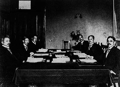 『二十一条』签字时中日代表合影。左起:(中方)外交次长曹汝霖、外交总长陆徵祥、秘书施履本;(日方)参赞小幡西吉、驻华公使置益、书记官参赞高尾1915年袁世凯接受日本无理要求,签订丧权辱国的