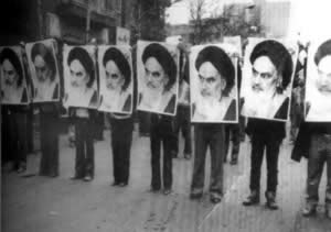 举着霍梅尼像的游行队伍1979年5月26日,伊朗的阿亚图拉·霍梅尼强烈谴责卡特政府企图杀害伊朗政府的高级官员。美国国务院驳回这一谴责。25日晚,确信是统治革命委员会成员的阿亚图拉·哈谢米·拉
