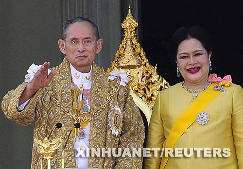 泰国国王普密蓬·阿杜德(左)和王后诗丽吉在首都曼谷市中心的大王宫大殿阳台向人们挥手普密蓬·阿杜德,泰国国王(拉玛九世)。1927年生于美国马萨诸塞州坎布里奇市。前国王朱拉隆功(拉玛五世)之孙。