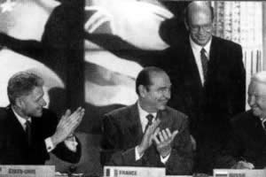 俄罗斯与北约首脑在签字仪式上1997年5月27日,俄罗斯与北约关系文件在巴黎签署。其文件要点是:目的和基本思想俄罗斯和北约不把对方视为潜在的敌人,将努力缓和过去的对抗,加强彼此的信任与合作。北约将通过扩大