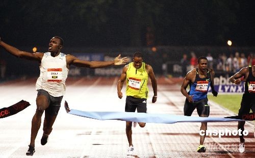 2008年5月31日晚,年仅21岁的牙买加选手博尔特在美国纽约举行的锐步田径大奖赛以9秒72的成绩打破了男子100米的世界纪录。此前的纪录为博尔特的牙买加同胞鲍威尔去年创造,这次比赛他因故缺席。图为博尔特(左一)在