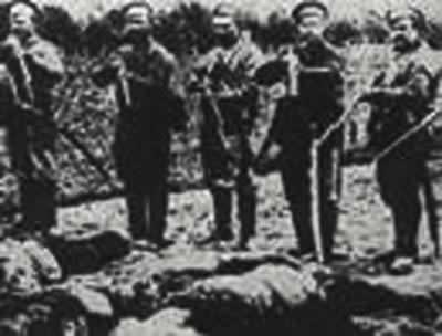 俄国白军中的哥萨克人展示被害的布尔什维克人5月31日,俄国可能已经与同盟国签订了和约,但俄国并没有得到和平。外国军队正在重新入侵俄国,俄国社会已在一场激烈的内战中分裂。顿河地区哥萨克军的新首领彼得-克拉斯