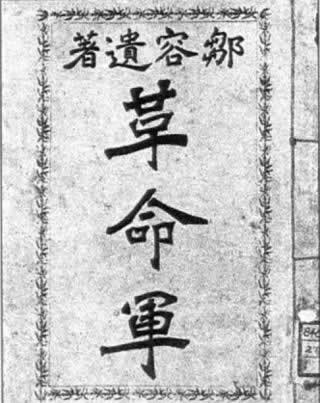 邹容著《革命军》1903年5月,邹容的《革命军》由章炳麟作序,革命党人集资,由上海大同书局出版,立即轰动全国,被视为中国的『人权宣言』。先后翻印20余版。各地为之纸贵,销售量达110万册,为当时第一大畅销书。许