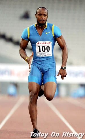 图:阿萨法·鲍威尔2005年6月14日,牙买加22岁的田径明星阿萨法·鲍威尔在希腊雅典打破男子100米短跑世界纪录,成绩是9.77秒。这一成绩比2002年美国人蒙哥马利在巴黎创造的9.7