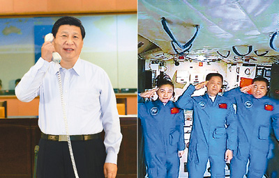 图:习近平与航天员通话2013年6月24日,中共中央总书记、国家主席、中央军委主席习近平来到北京航天飞行控制中心,同正在天宫一号执行任务的神舟十号航天员聂海胜、张晓光、王亚平亲切通话。人民日报6月