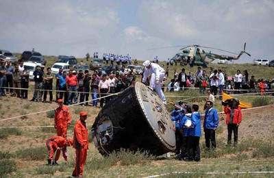 图:神舟九号航天飞船成功返回地面2012年6月29日上午10:05在空中10多天后,中国神舟九号航天飞船成功返回地面,着陆成功安全返回,搜救人员打开神舟九号舱门,迎接三名宇航员胜利返航,截止10点19分,舱门已经打