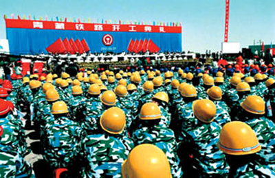 2001年6月29日举世瞩目的青藏铁路开工典礼,在青海省格尔木市和西藏自治区首府拉萨市同时举行。朱镕基总理和吴邦国副总理分别在格尔木和拉萨参加剪彩仪式。图为格尔木站的开工现场。青藏铁路是我国实施西部大开发战