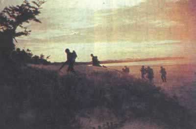 美国人在进入渺无人迹的丛林前穿过一个滩头阵地1965年6月29日晚,美国部队紧跟西贡政府的部队第一次在越南执行战斗任务。这次战斗是一次扫荡。目标是西贡东北部20英里处一个共产党的据点D区。越共的迫击炮至少打死一