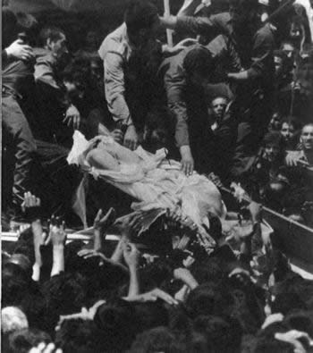 群众扑向棺材哀悼这位被流放国外长达15年的老人,在他78岁高龄时发动了伊斯兰革命,取得了伊朗的实质领导权,成为伊朗宗教领袖。从此,他力图将一个『被西方文化异化』的伊斯兰世界带回伊斯兰原教旨主义的『正轨』。