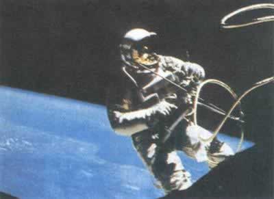 爱德华·怀特成为第一位在太空漫步的美国人东西方不断加快的空间竞争又经过了一个里程碑。1965年3月18日苏联宇航员阿列克谢-列奥诺夫成为第一个太空行走者。三个月后,被约翰逊总统斥责为『落在别人屁股后』的