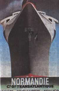 巨轮的广告画1935年6月3日,豪华客轮『诺曼底』号从南安普敦出发,以每小时29.7海里的速度到达纽约,又一次创造了横越大西洋航行速度纪录。载有1250名船员和1070名旅客的『诺曼底』号,轻而易举地打破了由德国客轮『