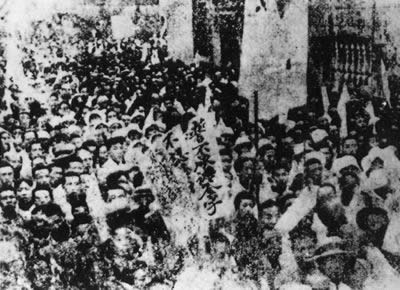 愤怒的民众1919年6月3日,中国工人阶级第一次进行大规模的政治罢工。从上海发起,纺织、机器、铁路、汽车、轮船、铁厂等50多个企业约7万工人罢工。其中沪宁、沪杭铁路工人总罢工,在全国影响极大。济南、天津、南京