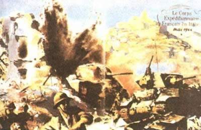 法国派遣军在一片混乱的意大利战场上1944年6月4日,盟军以惊人的速度击溃了纳粹的最后反抗,于当天晚上开进罗马。他们受到了城中许多居民的热情欢迎。罗马对盟军来说没有什么战略价值。但它是轴心国家的首都之一,也